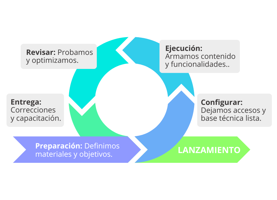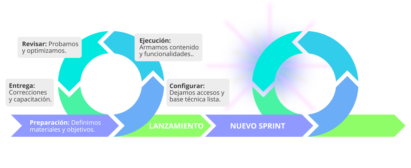 Nuestro modelo de trabajo se basa en sprints: periodos cortos, claros y enfocados. Así logramos lanzar tu sitio o tienda en menos tiempo, con menos ruido y mayor impacto.